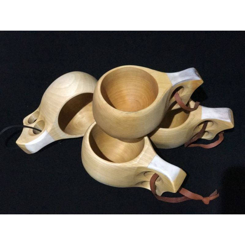 Wooden cup, appr. 1,5dl, leather ribbon, reindeer horn decoration, birch