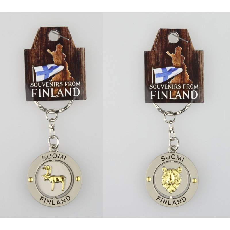 Keyring, round, reindeer/bear flipper, Suomi-Finland