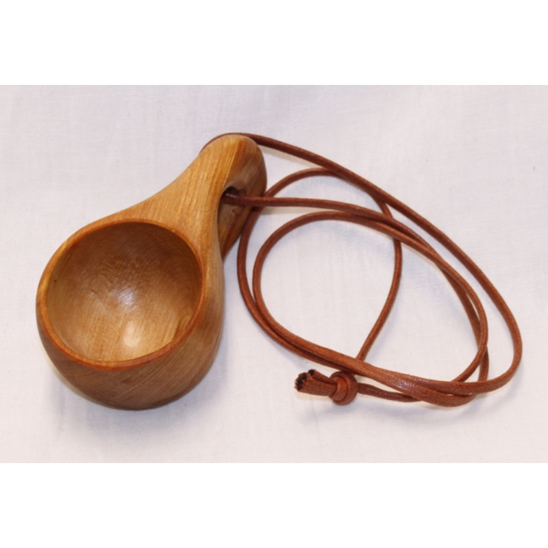 Wooden cup, ”shot glass” size, leather ribbon
