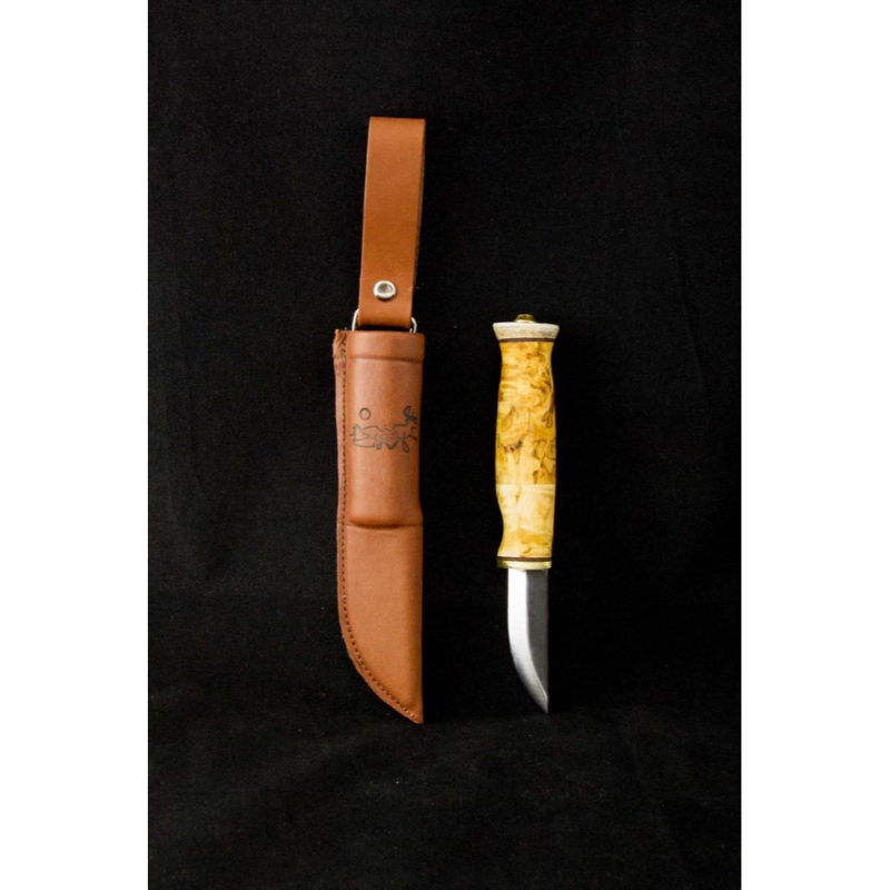 Knife, curly birch and reindeer horn, 6,2cm blade