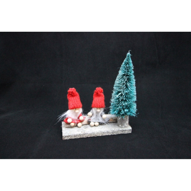 Small elfs and Christmas tree on wooden base